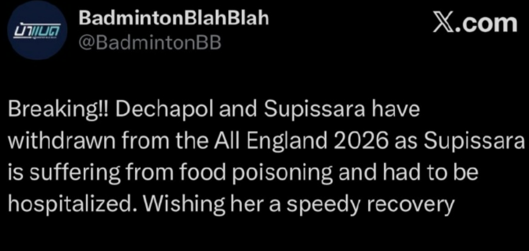 这也使得郭新娃/陈芳卉递补到了这对赛会3号种子的,虎扑03月03日讯 2026全英羽毛球公开赛今日开赛。据相关报道,泰国羽毛球混双选手苏皮萨拉正在赛前倒霉食物中毒的环境入院医治,